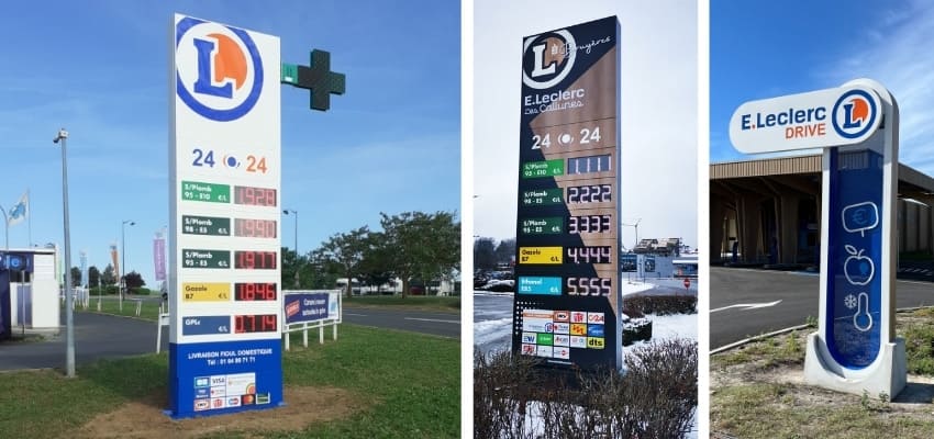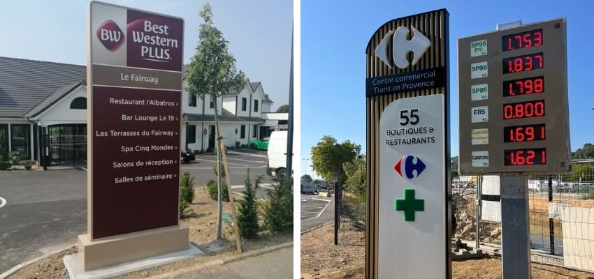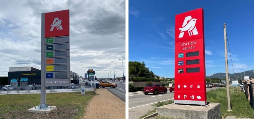 Totem simple ou double face, totem carburant avec afficheur numérique. Il peut avoir une ou plusieurs faces découpées à la forme et/ou galbées, du texte évidé, des éléments en relief ajoutés sur le support. Il peut être lumineux ou non. Nous avons une expertise dans la conception et réalisation de totem de station-service permettant d’afficher les prix des carburants dans le respect des obligations légales.