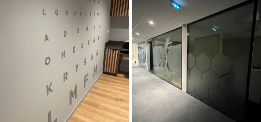 Lettrage PVC/PMMA, directory, plaque de porte, vitrophanie (imprimée, découpée, adhésif cristal, dépoli). Idéal pour communiquer et informer clients et collaborateurs. Solutions sur mesure pour un environnement plus sûr et plus ergonomique.